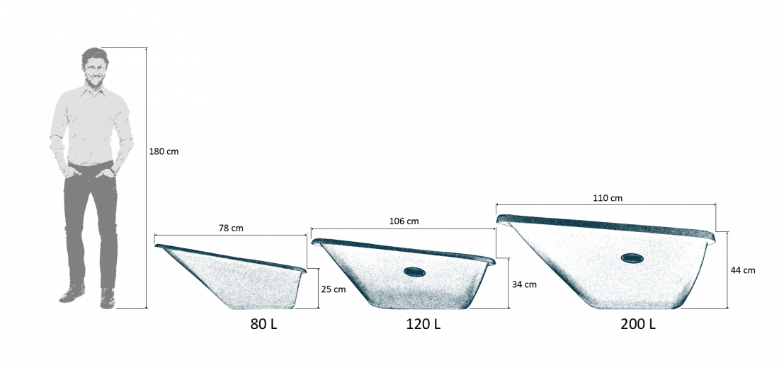 Kunststoffladeschale 200 l: Breite 80 cm, Länge 110 cm, Tiefe 44 cm, Gewicht 8,6 kg