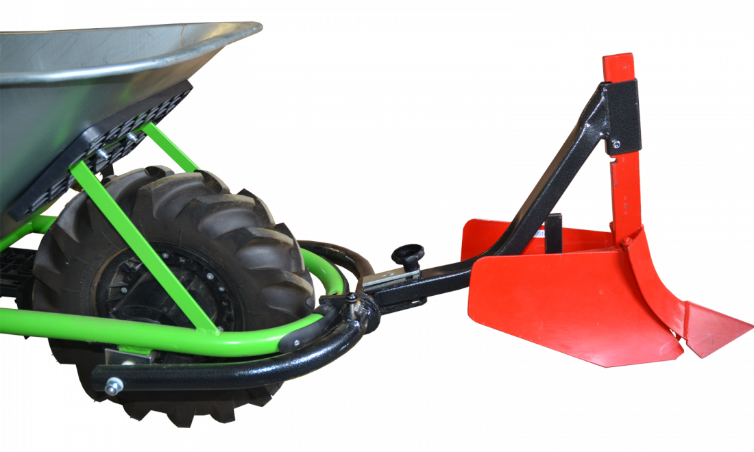 Dies ist ein Frontzubehör. Zur Befestigung an die Motokarre ist ein Universal-Zubehörträger erforderlich! Das An- und Ausziehen ist eine Sache von Sekunden. Die Furchenschar ist zum Pflügen von Furchen, insbesondere in lockerem Boden, der regelmäßig bearbeitet wird, bestimmt. Die Schar kann auch zum Rudern oder Ausgraben von Kartoffeln verwendet werden. Beim Arbeiten mit dem Furchenpflug muss die Motokarre mit 30-50 kg belastet werden, damit das Rad nicht durchrutscht.
