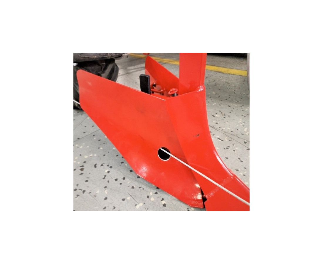 Wenn der Boden nicht gut vorbereitet und gelockert ist, besteht die Möglichkeit, sich mit der Winde an der Motopkarre zu helfen. In diesem Fall müssen Sie eine Winde installieren und diese Schar mit einem 25-mm-Windenloch versehen haben. Das Seil wird dann an einem festen Punkt in der Richtung, in die wir pflügen wollen, befestigt, oder es kann ein fester Pflock verwendet werden, der mindestens 40 cm tief in den Boden geschlagen wird, damit er nicht wegfliegt und verursacht Schäden oder Verletzungen.