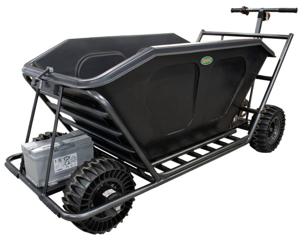 Transport platform Jumbo Double has two front wheels with wide tire 16 cm, each has own motor 300 W. It is strong model of Mobarrow, which can carry up 450 Kg. His quality will be appreciated during transport of bulky and heavy stuff as grass, compost, feed mixture, hay, straw, biological waste etc. So all hard work do instead of you accumulate electricity.