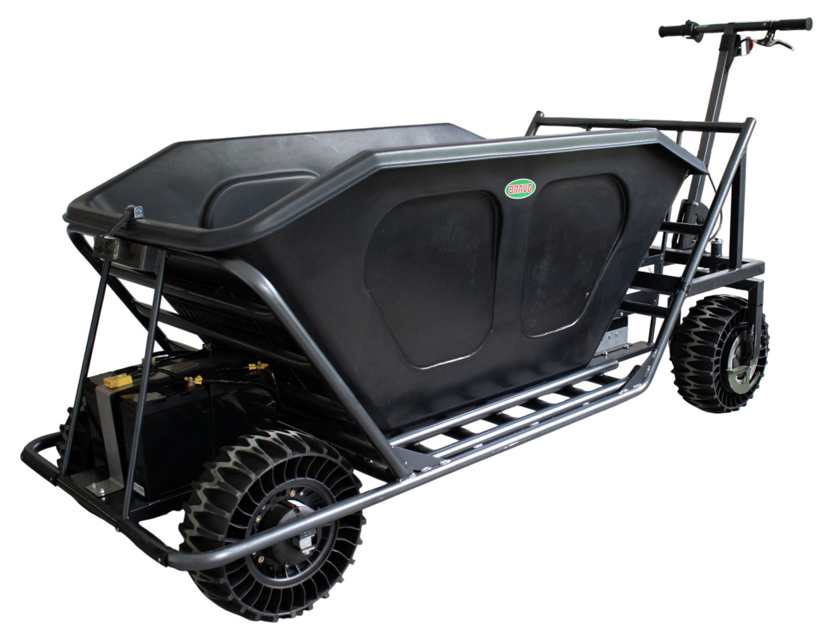 Čtyřkolka má poháněná všechna 4 kola s pneumatikou o šíři 16 cm, kde každé má vlastní pohon 300 W. Jedná se zatím o nejsilnější typ Motúčka s nosností až 630 Kg. Jeho kvality oceníte při přepravě objemného a těžkého materiálu jako je dřevo, stavební materiál, hnůj atd. právě i v těžkém terénu, nebo v kopci. Díky obrovské korbě a nosnosti, už se s těžkým nákladem nenadřete a práci za Vás obstará výkonná elektřina.