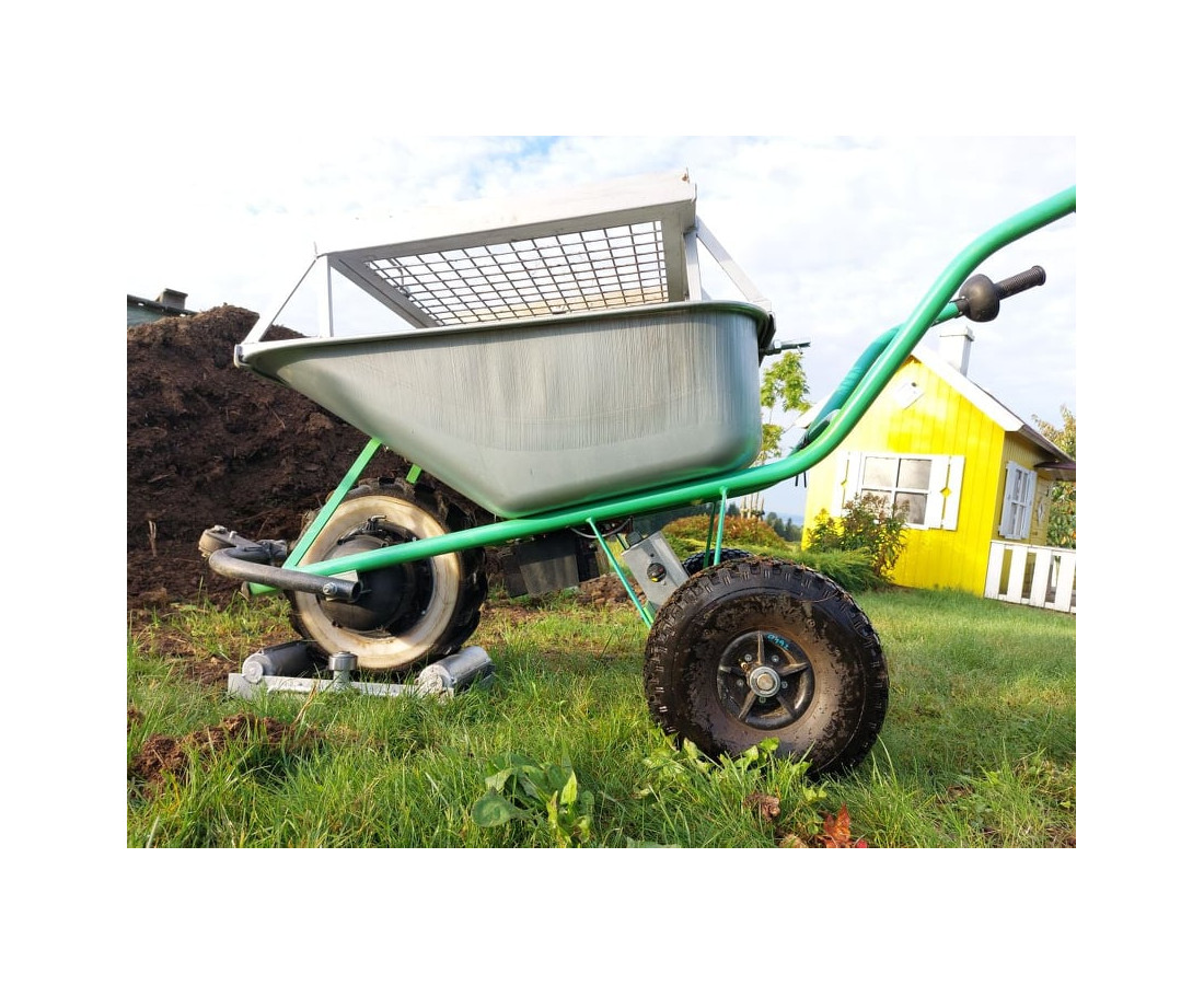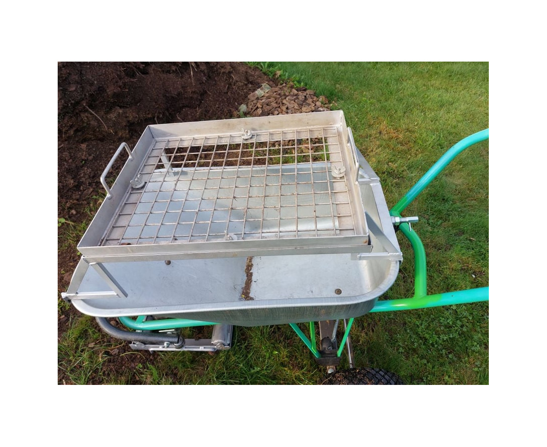 Práca je veľmi jednoduchá a efektívna: Rotačnú podložku umiestnime kdekoľvek na zem (trávnik), umiestnime do nej predné koleso Motúčka, na korbu položíme a rýchoupínačom upevníme Rám, do ktorého vložíme Sito zvolenej hustoty oka (2x2, 3x3 alebo 4x4 cm).
